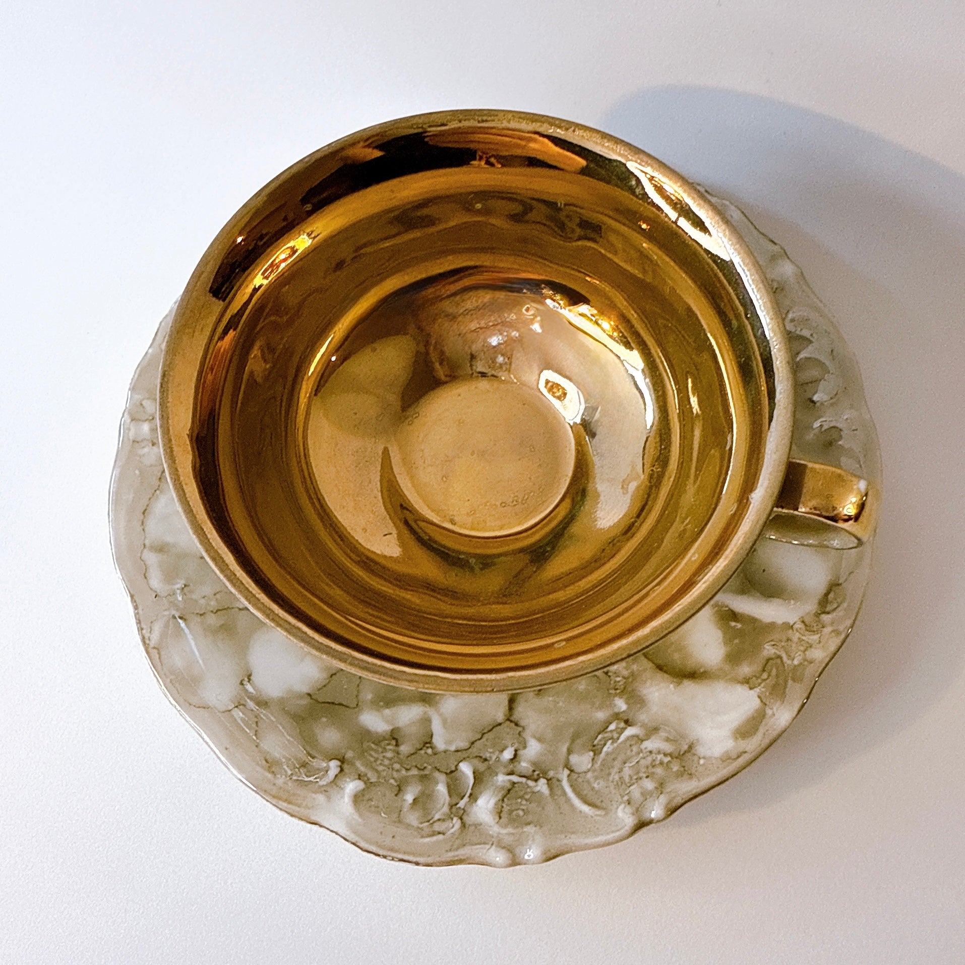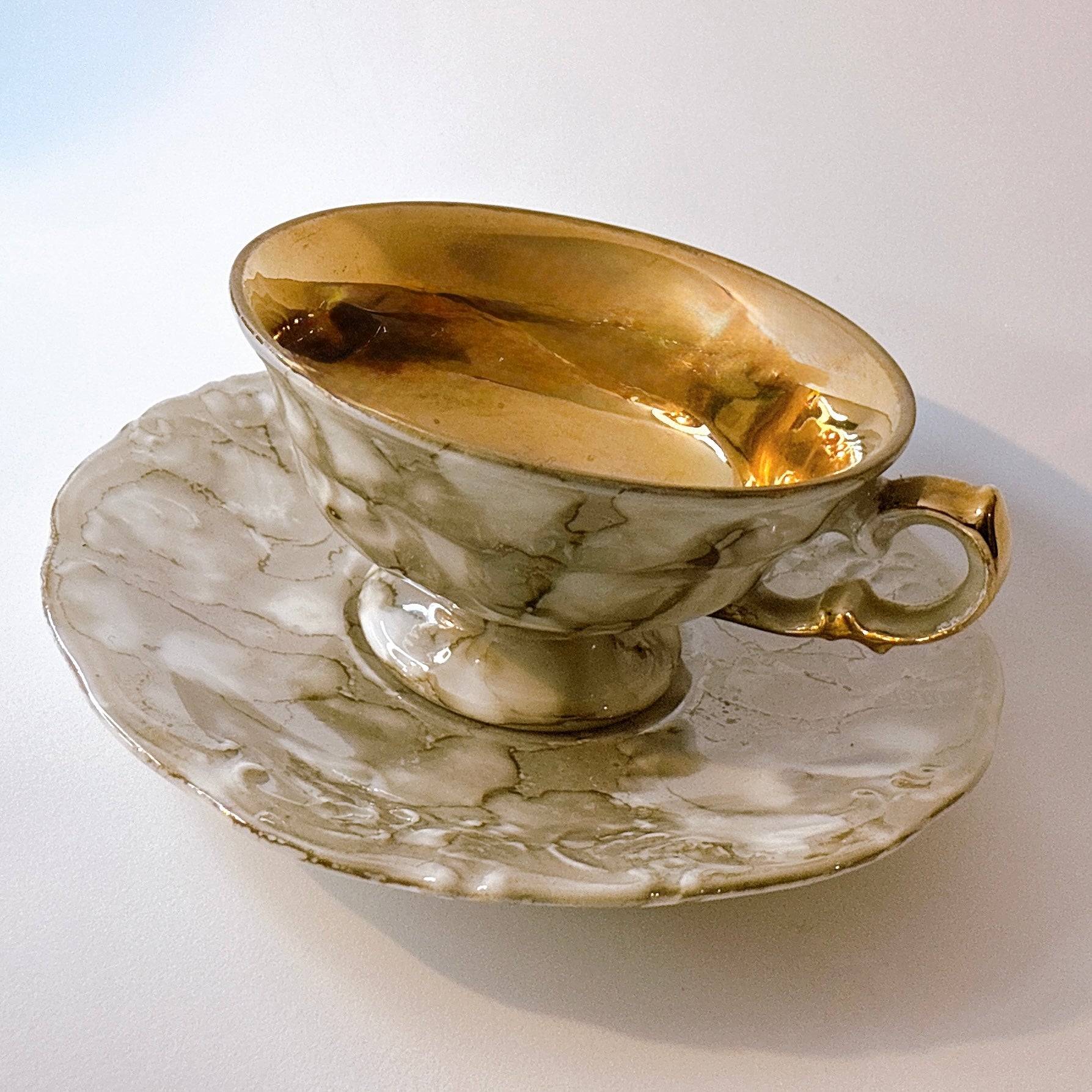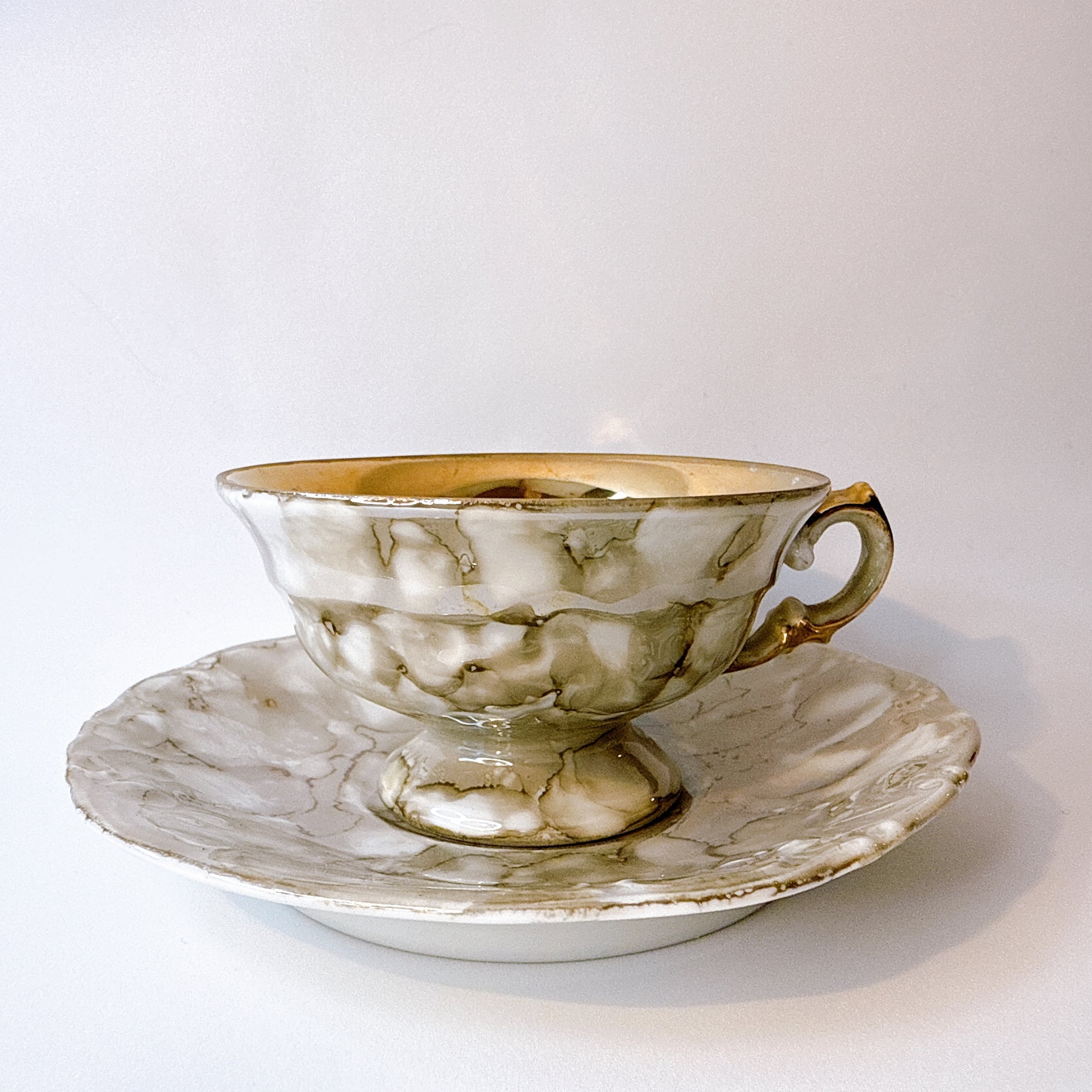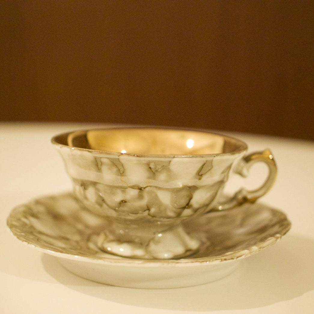 大理石調の釉薬と内側のゴールド仕上げが特徴的な一点です。