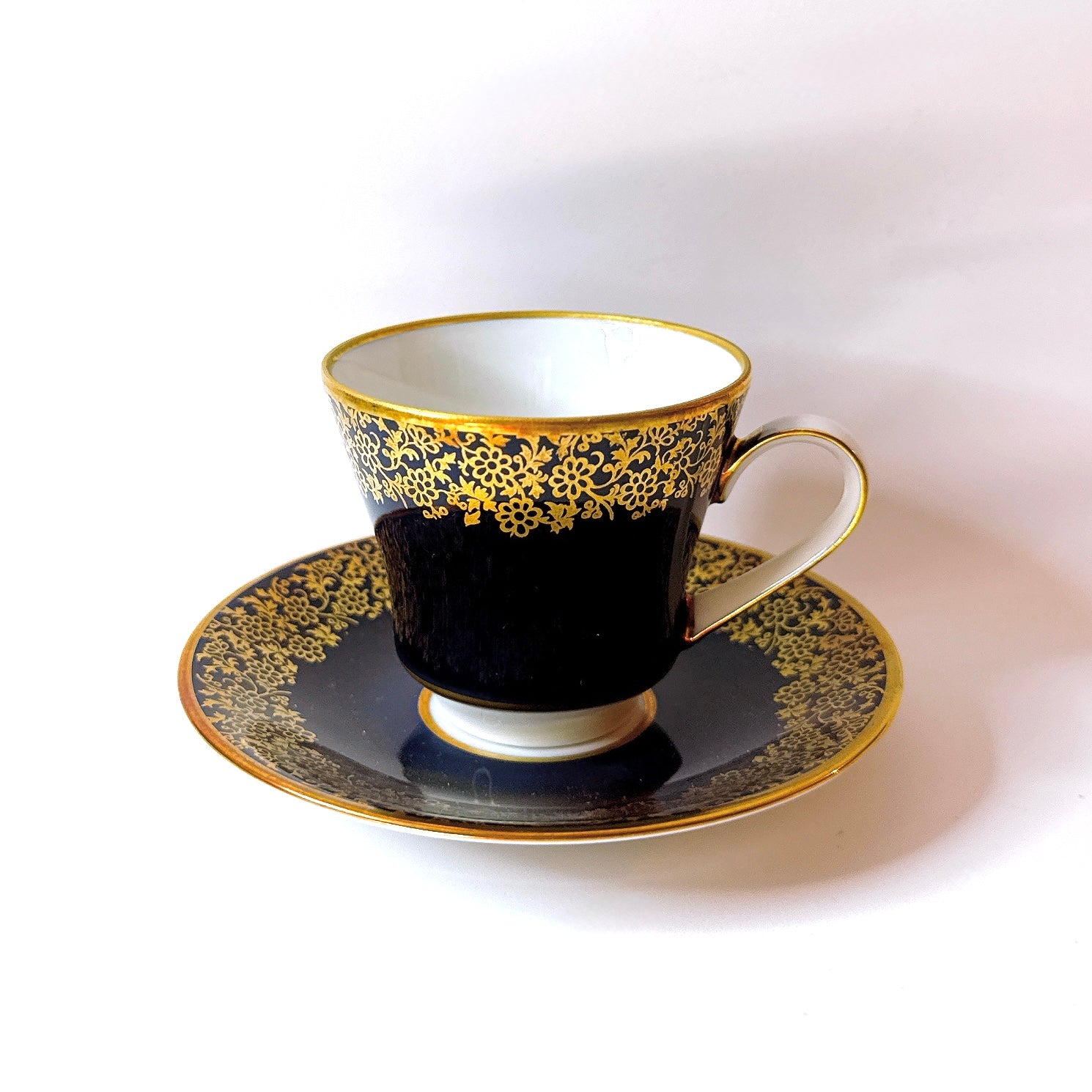1970年代頃のドイツ・バイエルン地方で作られたヴィンテージのカップ&ソーサー。深みのあるネイビーカラーに、繊細な金彩装飾が施された上品な一客です。